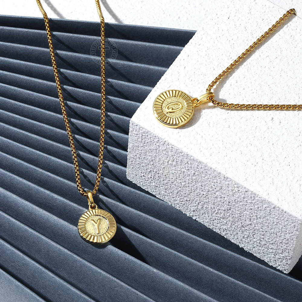 Initial Letter Pendant Necklaces Gold Round Charm Stainless Steel Box Link Chain For Women Men Jewelry Gift Dropshipping GP418A